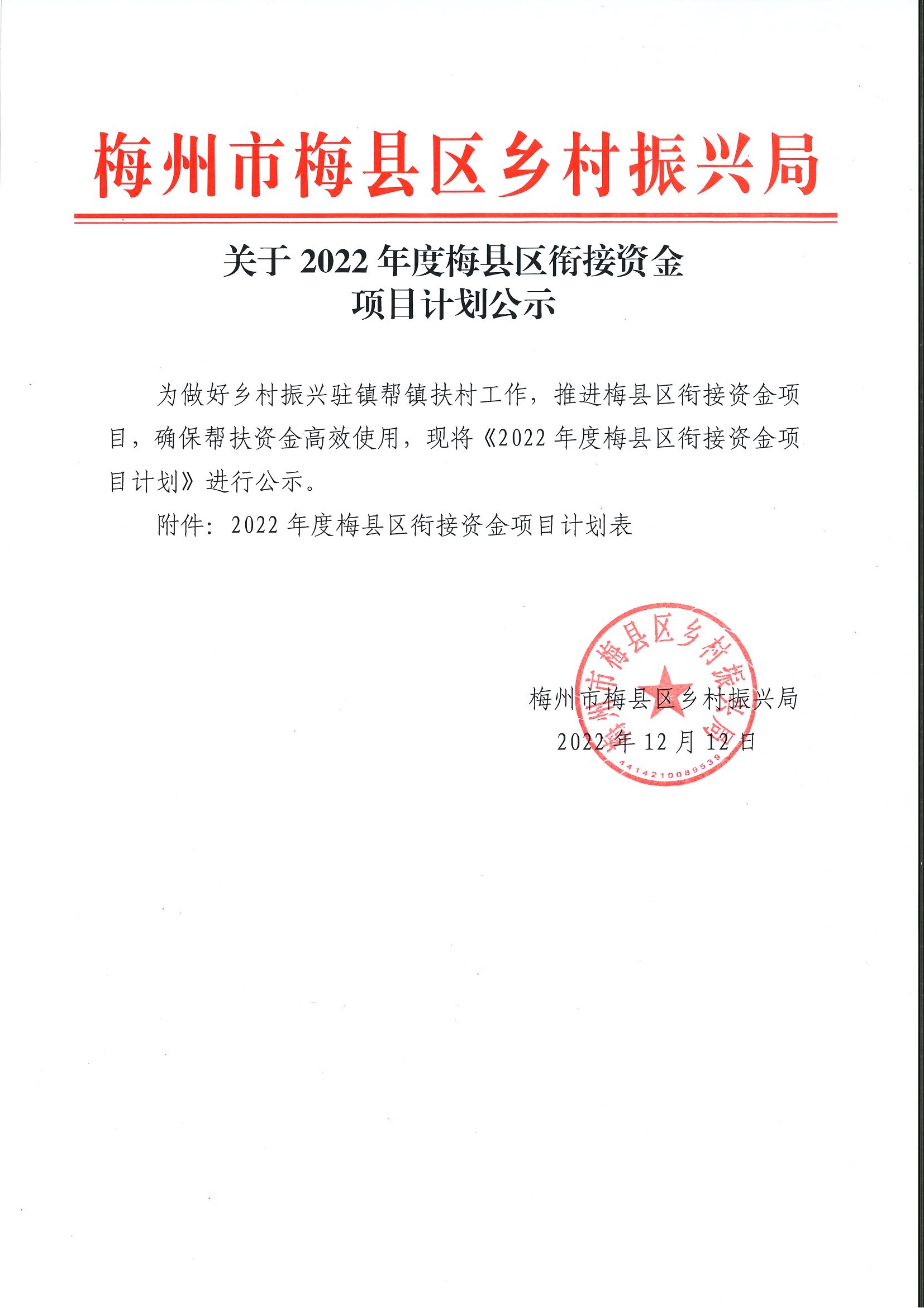 關于2022年度梅縣區銜接資金項目計劃公示