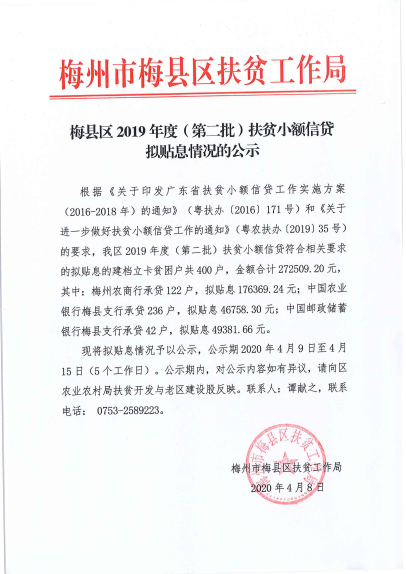 梅縣區2019年度(第二批)扶貧小額信貸擬貼息情況的公示