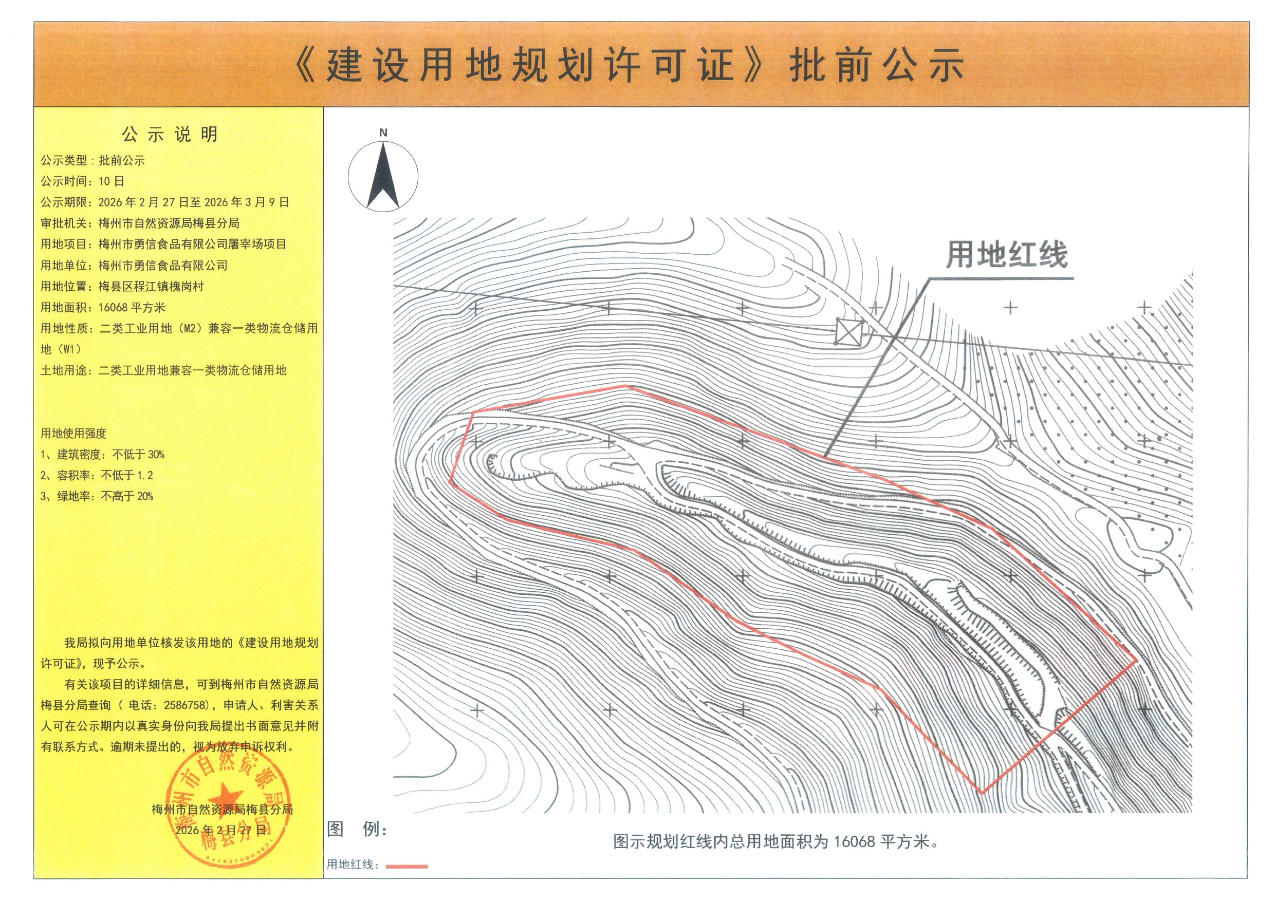 我局擬向梅州市勇信食品有限公司核發該用地的《建設用地規劃許可證》,現予公示。