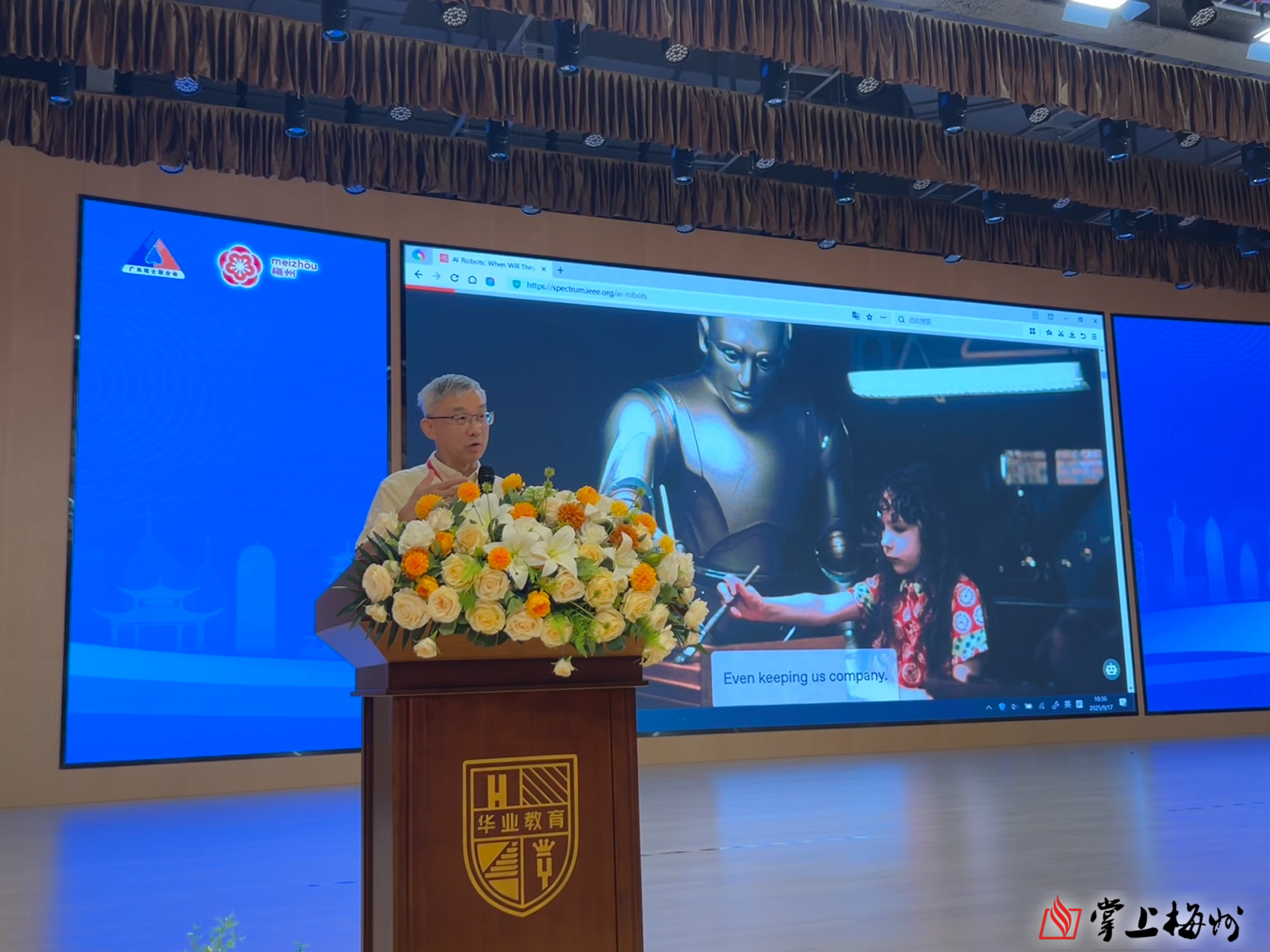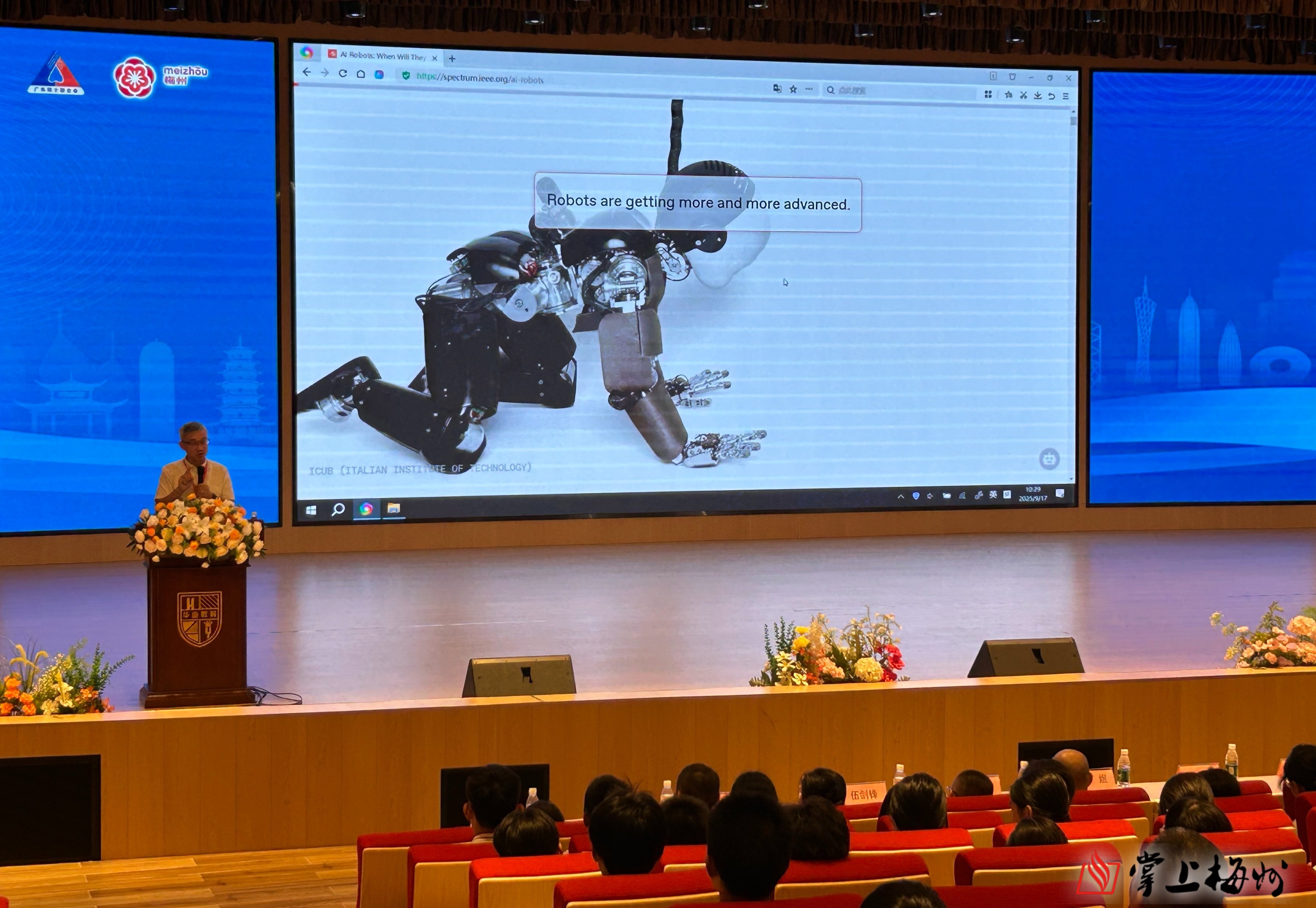 王煜首先參觀了梅州市梅縣區(qū)華業(yè)外國(guó)語(yǔ)高級(jí)中學(xué),了解學(xué)校情況,隨后在學(xué)校報(bào)告廳以《人形機(jī)器人時(shí)代真的到來(lái)了嗎?》為題,為該校師生帶來(lái)了一場(chǎng)精彩紛呈的科普講座。講座中,王煜教授以機(jī)器人在家庭生活以及社會(huì)各領(lǐng)域場(chǎng)景的實(shí)際應(yīng)用為切入點(diǎn),借助圖片、視頻等資料,用通俗易懂的語(yǔ)言深入淺出地闡述了人形機(jī)器人發(fā)展現(xiàn)狀與未來(lái)前景。