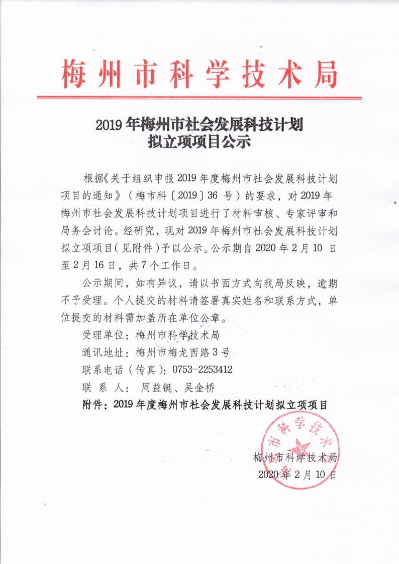 2019年梅州市社會發展科技計劃擬立項項目公示