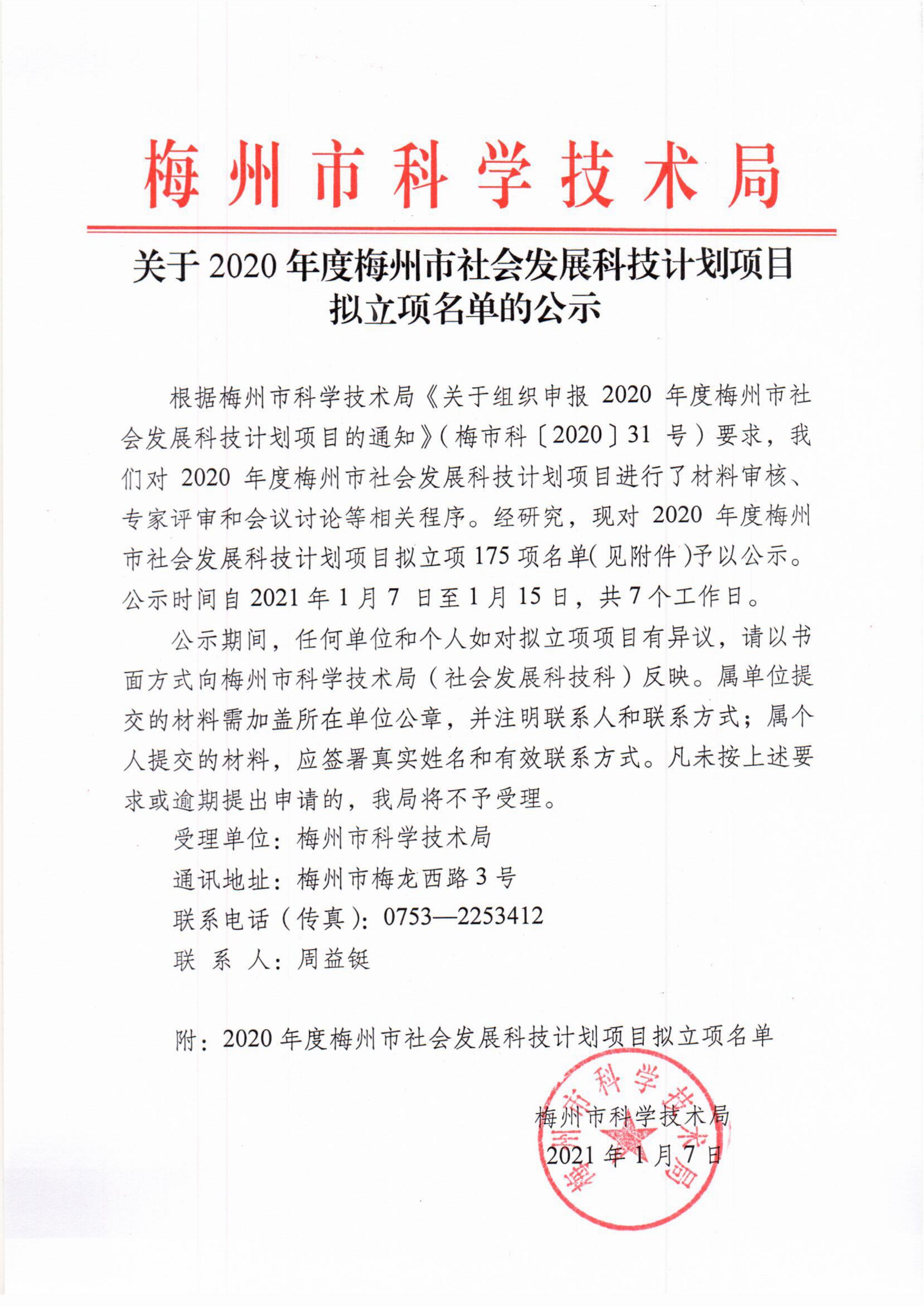 關(guān)于2020年度梅州市社會(huì)發(fā)展科技計(jì)劃項(xiàng)目擬立項(xiàng)名單的公示