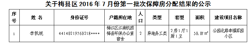 關于梅縣區2016年7月份第一批次保障房分配結果的公示
