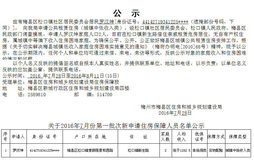 關于2016年7月份第一批次新申請住房保障人員名單公示