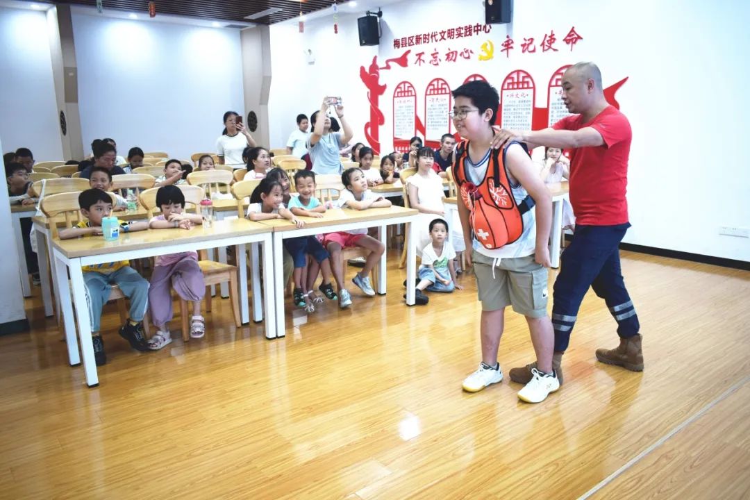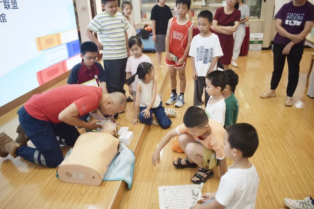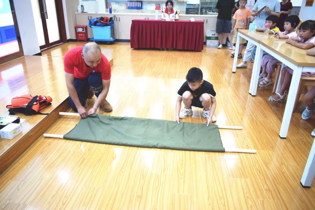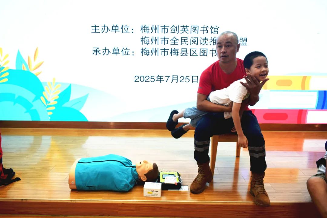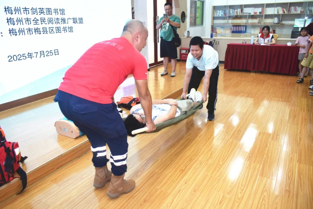 “救在身邊” 應急科普活動由梅州市應急志愿者協(xié)會救援隊李副隊長授課。活動采用授課與游戲相結合的形式,以生動有趣的方式向讀者傳授了豐富的急救自救知識——從救生衣穿戴、繩結打法、拋繩包使用,到簡易擔架制作,再到海姆立克急救法、心肺復蘇,每一個項目都講解得細致入微。