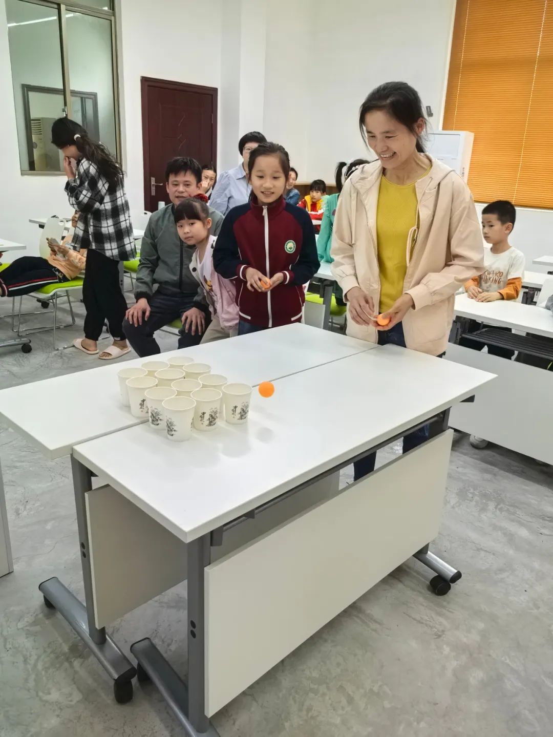 最后一個環節是親子游戲比賽,有紙杯保齡球和乒乓球跳進杯子贏獎品兩個游戲。第一個游戲由家長負責搭紙杯,孩子負責打保齡球,用時最少且打掉的紙杯越多的前三組家庭可以獲得獎品。第二個游戲是志愿者給每個家庭準備5個乒乓球,投進放有紙條12宮格紙杯里,投進哪個紙杯就獲得相應的獎品。兩個游戲都深受家長孩子的喜歡,最后大家也是收獲滿滿。