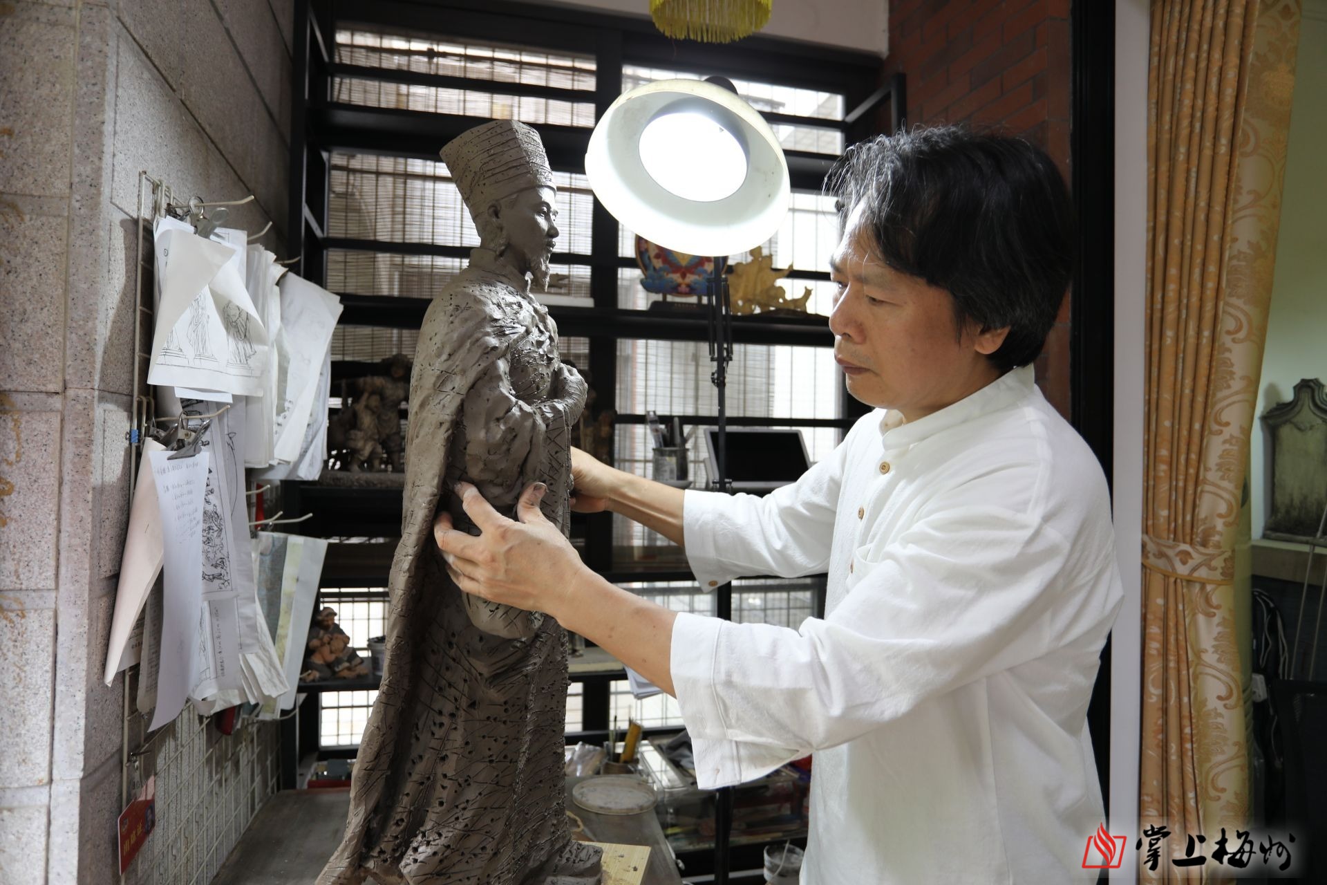 一堆陶泥、一把小刀、一雙巧手……走進梅州市級非遺項目客家泥塑代表性傳承人劉沅聲的家里,記者看到陶泥在劉沅聲的捏、搓、揉、掀之間,王陽明的生動形象便展現在眼前。“客家泥塑歷史悠久,在我們客家人聚居生產、生活的場所均能看到形形色色的各種泥塑,泥塑能夠表現人物、場景,將慢慢消逝甚至已經不復存在的民俗風情凝固下來,是保護客家傳統文化的一種載體。”劉沅聲介紹道。