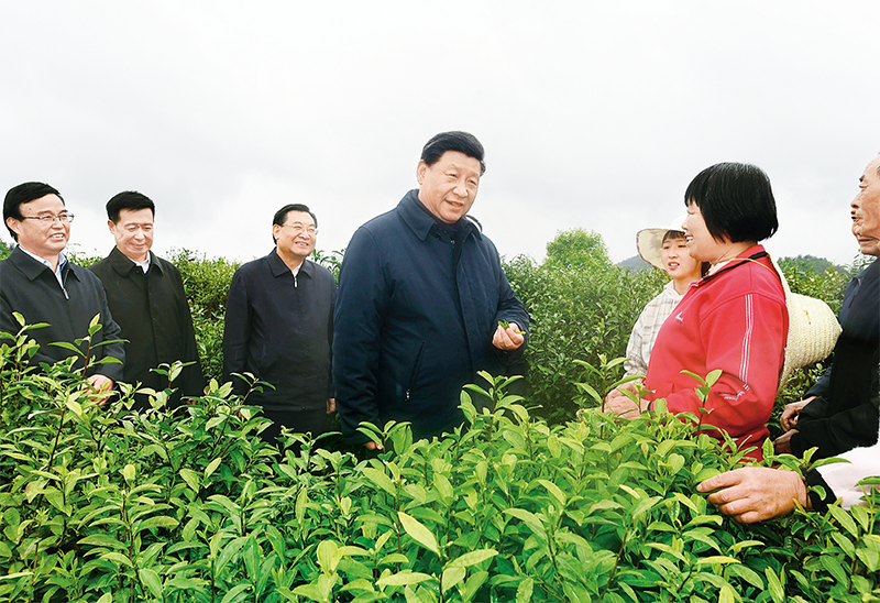 2020年4月20日至23日,中共中央總書記、國家主席、中央軍委主席習近平在陜西考察。這是4月21日,習近平在安康市平利縣老縣鎮蔣家坪村女媧鳳凰茶業現代示范園區,同茶農們親切交談。 新華社記者 謝環馳/攝
